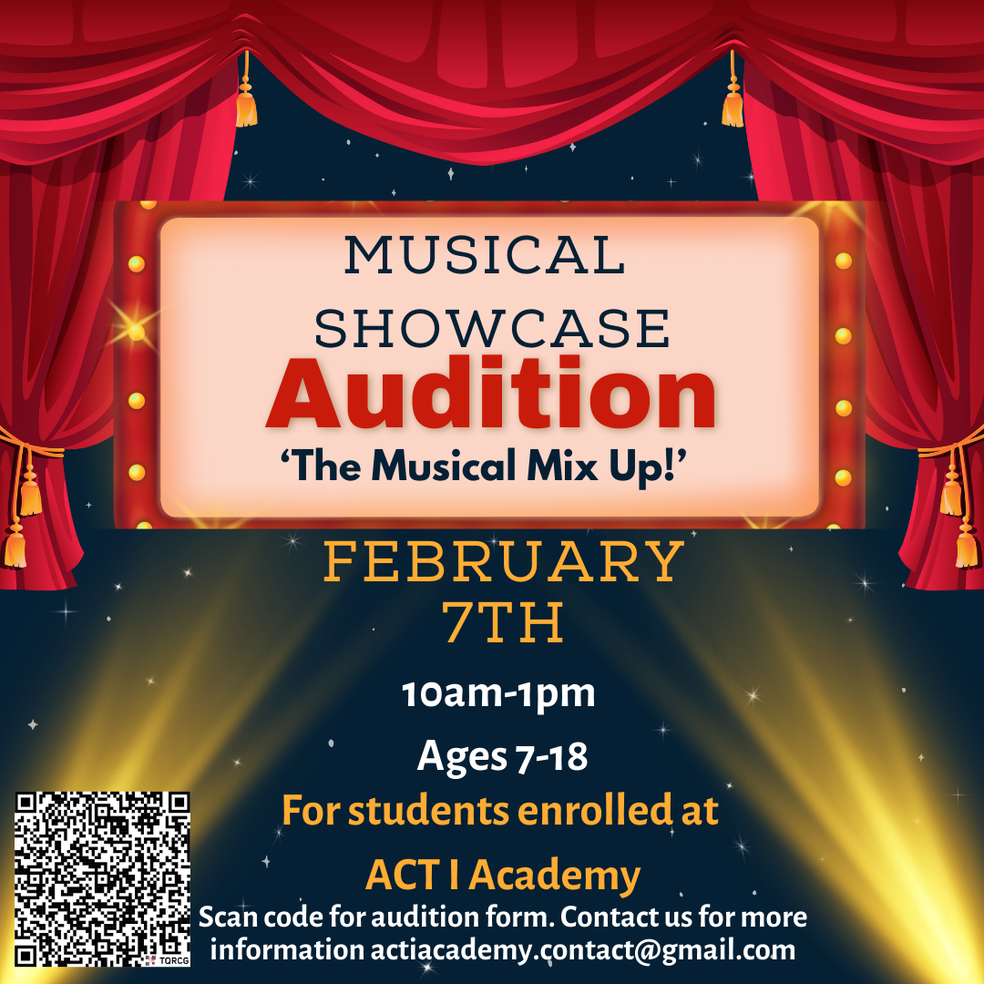 A virtual audition option is available on the audition form for those that are not able to attend the live audition.Student must be enrolled in a class or lessons at ACT I Academy in order to be eligible to audition.